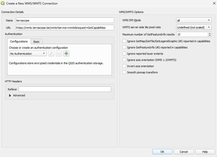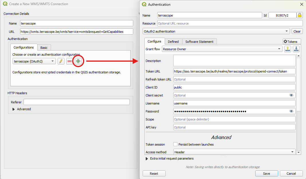 No authentication is required to access public WMTS layers. To access restricted layers, add OAuth2 authentication when creating or editing the connection. Choose the Resource Owner grant flow and fill in the following details: