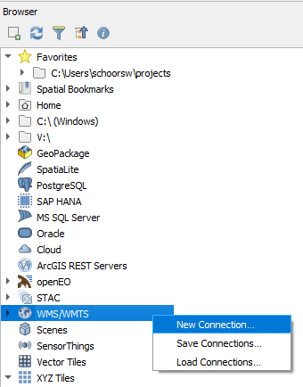 Locate WMS/WMTS in the tree, right-click it, and select New Connection…